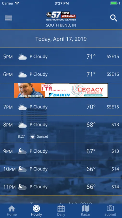 ABC57 First Warning Neighborhood Weather's redesigned app puts the expertise of all five of ABC 57’s meteorologists in your phone or tablet. Whether you've lived in Michiana a day or a lifetime, one thing is certain – Indiana and Michigan weather can change by the hour. Our app was designed to let you see our video forecasts and to use our weather tools to plan your day or night.