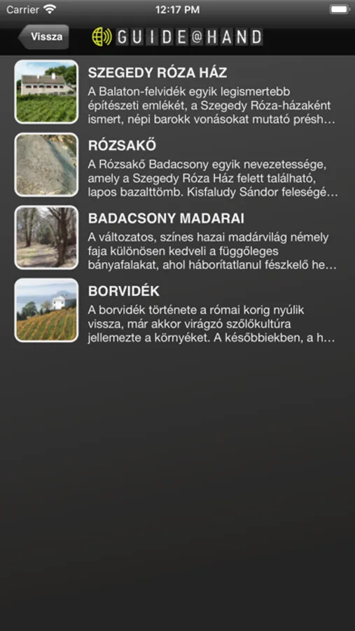 MAGYAR: A Badacsony GUIDE@HAND teljes turisztikai és a városnéző tartalmat, vezetett sétát, illetve térképet tartalmaz Badacsonyról.