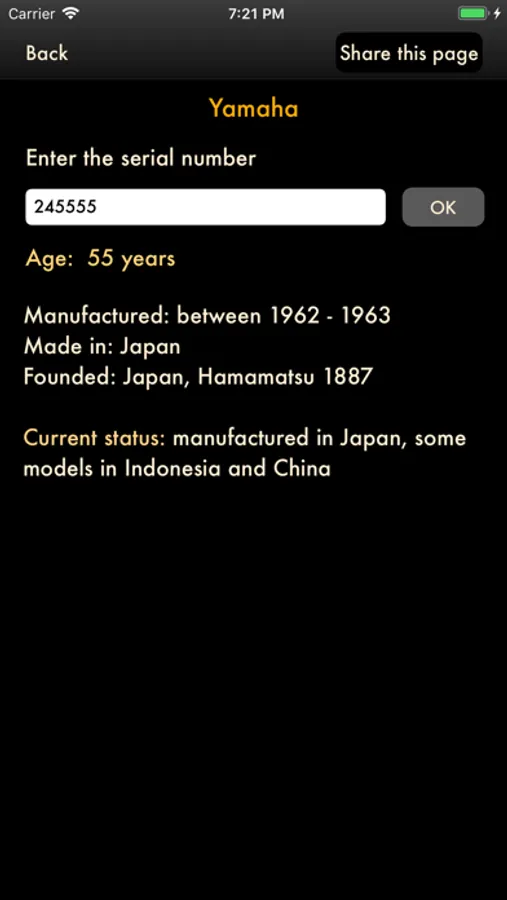 Often serial numbers also contain letters. For example Yamaha or Kawai serial numbers indicate the country of origin by letters withing the serial number. This is also posted in our application.