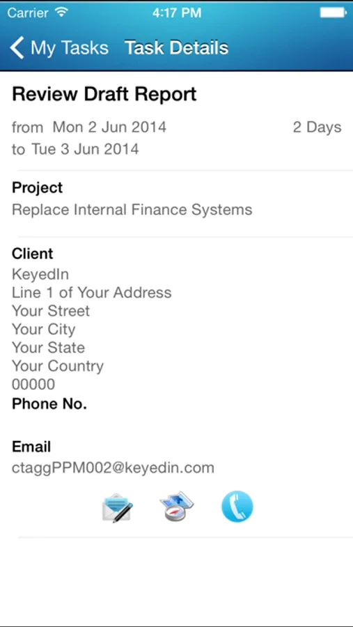 • Access Contact Information – view your KeyedIn Projects clients and contacts with full integration to your mobile device’s telephone, email and GPS capabilities