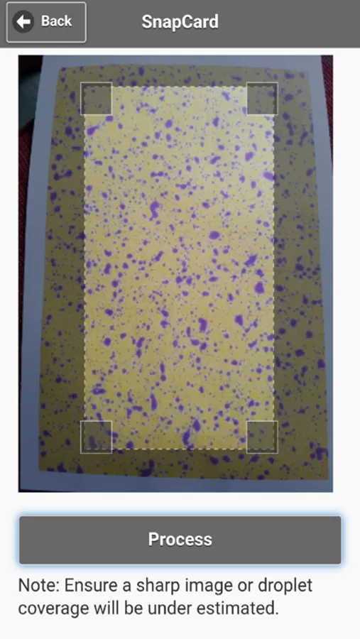 . Following treatment, spray cards can be photographed by SnapCard and the image cropped to the area of the card with droplets.