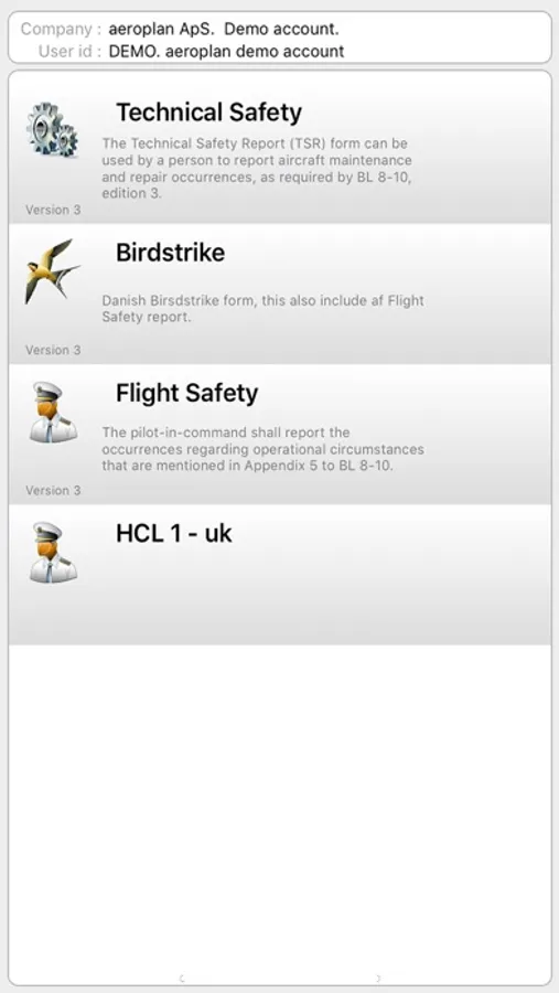 This program is used to create report for aviation companies. I can be a Flight Safety, Bird strike, Technical, ATIR, Dangerous goods or company voyage report etc., and requires a working license to the aeroplan report system. The reports will automatic synchronic with your company’s report. The app can be uses to create a report offline (in the cockpit etc.), and when Internet connection available, the app will send the report to the system. If you forgot to send the report the app will send you a notification to remind you the send the report. The backend system is a part of a larger SMS system, required by law for AOC companies.