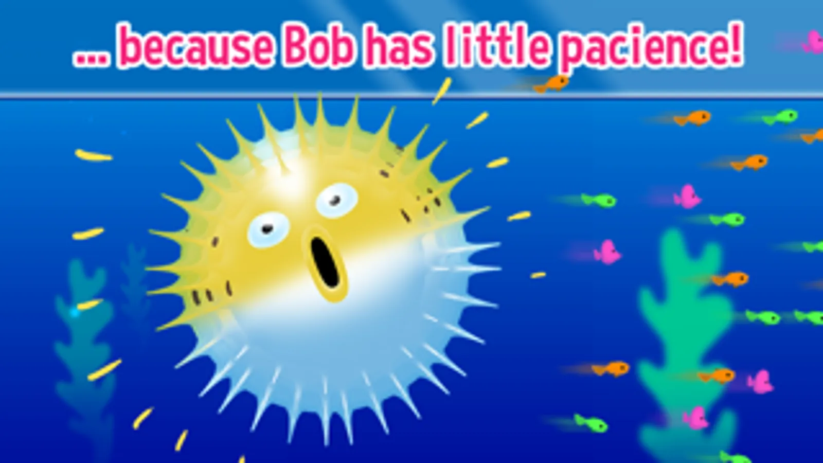 Meet Bob! Bob is a blowfish that loves to stay quiet and peaceful, but other fishes have always been very curious about him. Well, Bob has got a surprise for them and he is counting on you to help him. Give Bob a helping hand -- actually a finger will do!