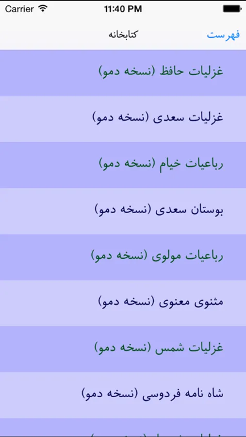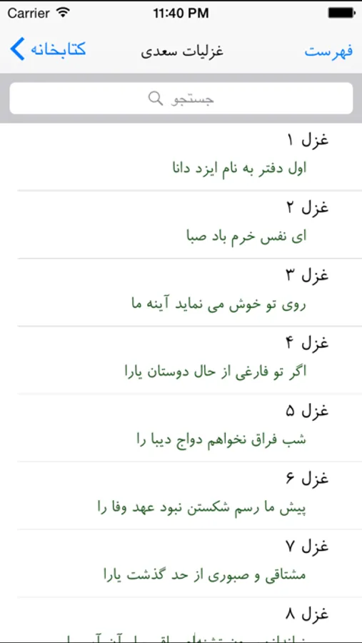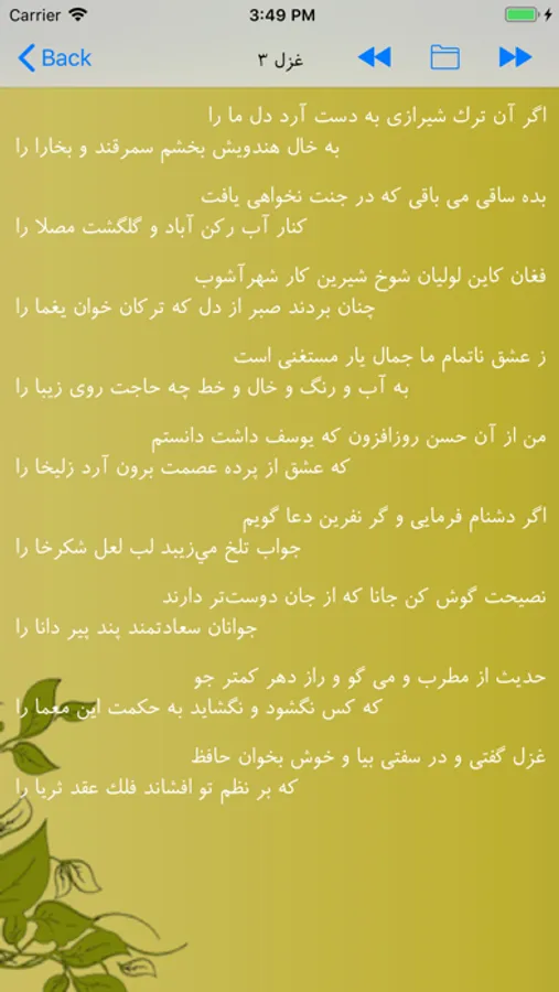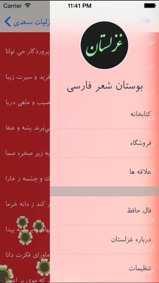 «Ghazalestan» is a Farsi app with a broad range of persian poetries mostly classic including poems from Hafez, Sadi, Khayyam, Molavi (Masnavi and Shams), Ferdowsi, Nezami, Attar, Shahriar, ... . This app is designed by the owner of Ghazalestan website (www.ghazalestan.com). In the near future, you will be able to create and connect to an account in order to save your favourite poems and access them using the website or the app.