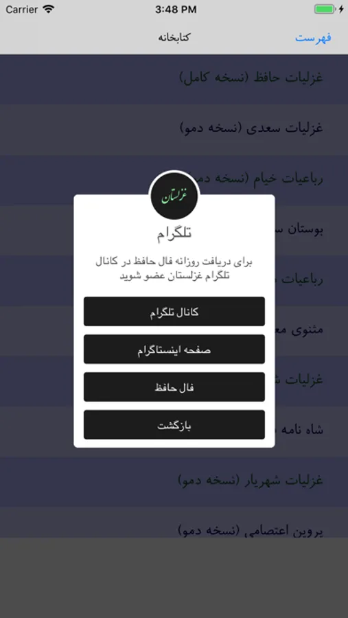 «غزلستان» کتابخانه اشعار کلاسیک فارسی شامل غزلیات حافظ و سعدی، رباعیات خیام، مثنوی معنوی، غزلیات شمس، شاهنامه فردوسی و ... در قالب یک برنامه است.