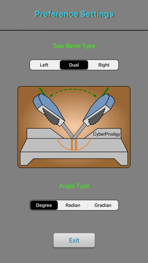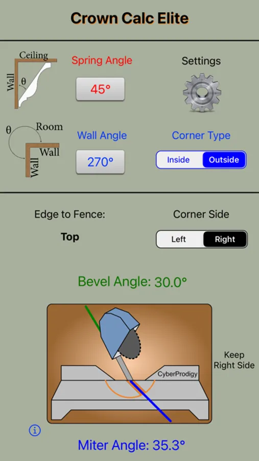 This app includes illustrations for getting your compound miter saw in the right position for each cut you need to make. It takes the guesswork out of finding the bevel and miter angles so you can get the cut right the first time.