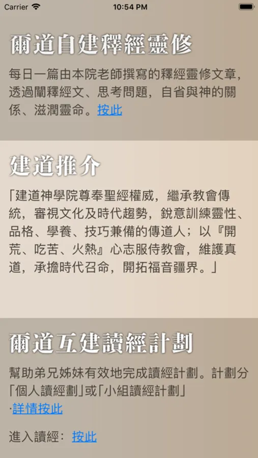 2015年1月1日開始,以釋經靈修為主的「爾道自建」流動應用程式(APP)會有全新面貌。除了提供每日一篇靈修文章和語音讓信徒作為每天親近神的屬靈食糧之外,還加增全新功能包括: