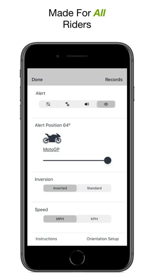 Real time motorcycle lean angle alert system. Specifically designed to alert you of your bikes lean angle with audio and visual cues so you're not focusing on your device while riding.
