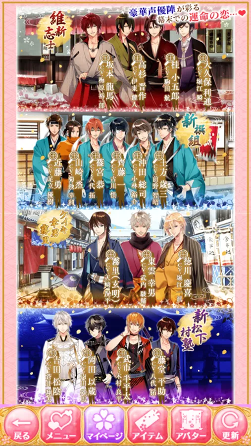 歴史を動かす俺様志士「坂本龍馬」、鬼の新撰組副長「土方歳三」、美しき次期将軍候補「徳川慶喜」、新松下村塾の師範「吉田松陰」…時代を彩る、あの幕末の有名人が勢揃い!