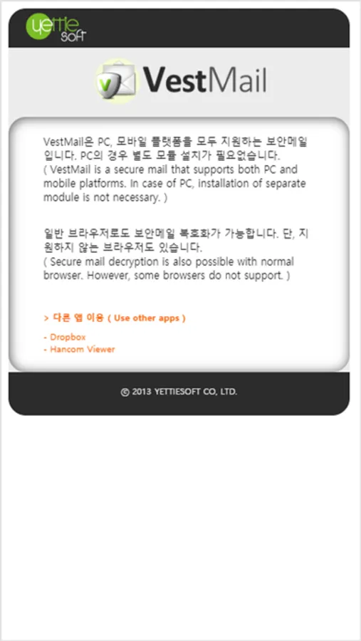 * VestMail은 예티소프트(www.yettiesoft.com)에서 제공하는 보안메일을 읽을 수 있는 스마트폰 프로그램입니다.