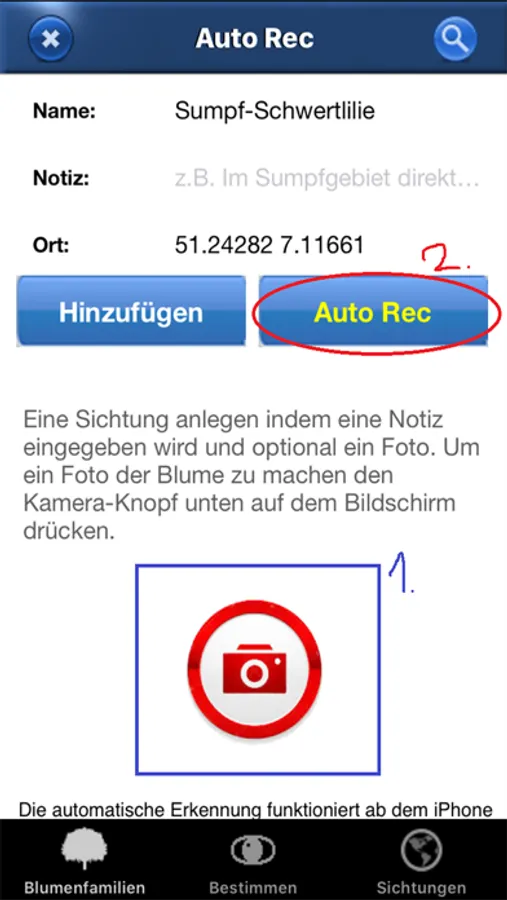 - Jede Blumenart kann mit GPS Daten auf einer Karte mit Fähnchen punktgenau markiert werden