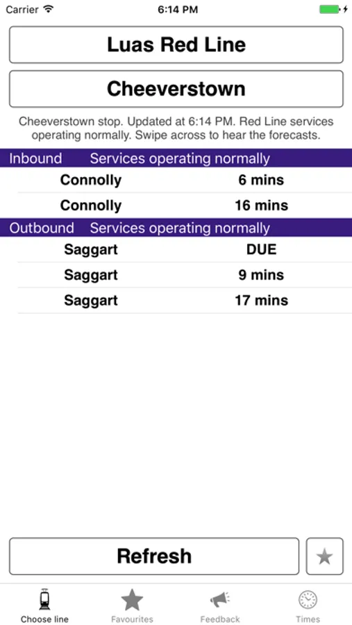The Luas VI app gives Luas Live Information: details of the next trams to any Luas stop going Inbound or Outbound. It also gives Operating Times, allows Users to save Favourites as a short-cut to the Live Info and allows Users to send feedback direct to Luas.