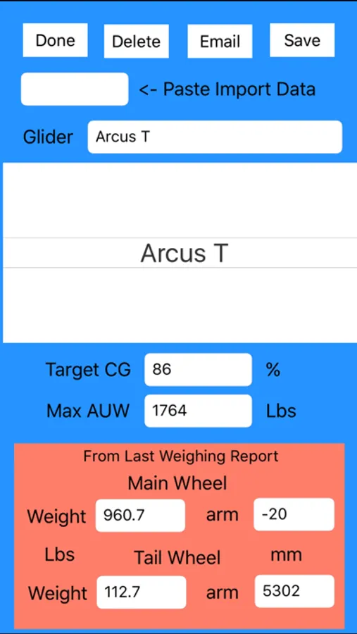 CG calc is designed for glider/sailplane pilots. Once specific glider data has been entered it is easy to change P1, P2, water ballast, tail tank loadings and determine AUW and CG position. Save multiple specific gliders on the Setup page and recall saved gliders quickly.