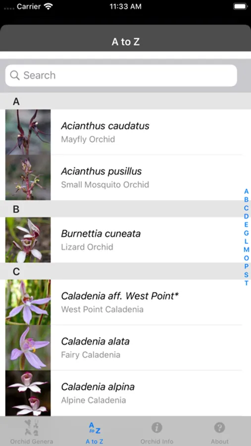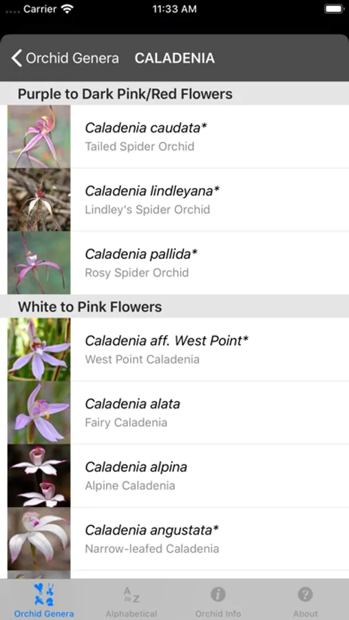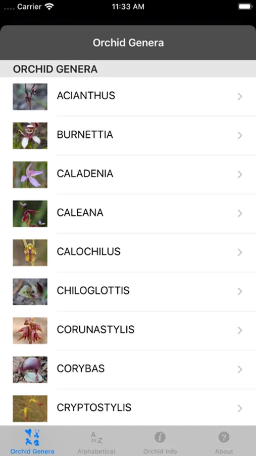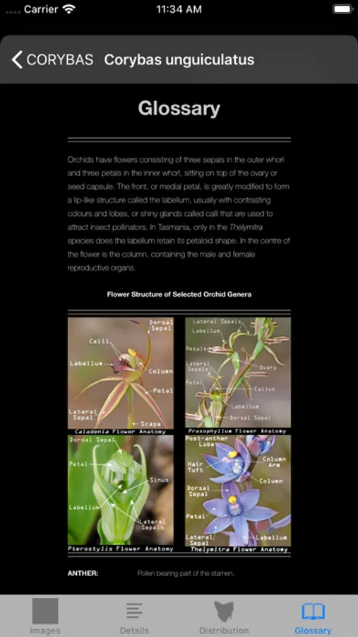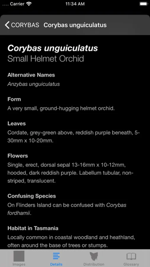 With over 450 detailed photographs, Orchids of Tasmania describes 197 of approximately 220 orchid species native to Tasmania, Australia, including 71 species endemic to that state. With a description of the botany of each species (Alternative Name/s, Form, Leaves, Flowers), along with the Preferred Habitat, main Flowering Period and Confusing Species the app assists in identifying both common as well as rarer species. A Distribution Map highlights where in Tasmania each species typically occurs while a Search Bar allows species to be located by either scientific or common name. As an aid to identification orchids may also be browsed by genus as well as flower colour. Orchids listed as threatened at both the state and national level are highlighted with a link to relevant sites for further species information. A Glossary as well as photographic descriptions provide information regarding orchid anatomy and reproduction.