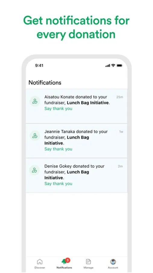 • Receive updates in real time: Never miss a donation or an important update about your fundraiser with timely app notifications