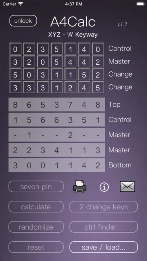 Automatically calculates the pinning chart for A4 SFIC. Built for 6 or 7 pin systems, however, less can be achieved by using a decimal to erase a chamber.