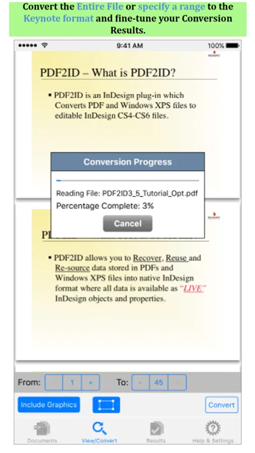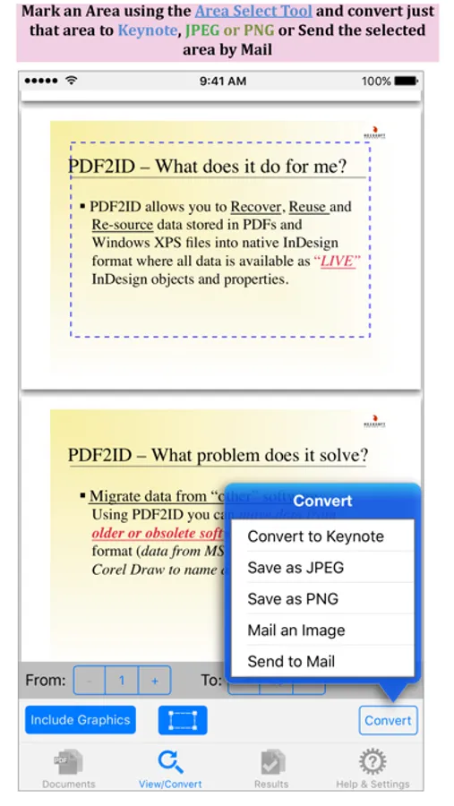 Convert PDF to Keynote documents instantly with a simple tap. Convert the entire document, range of pages or select and mark specific areas in a page to convert using the Area Select tool and have it editable on your iPhone!