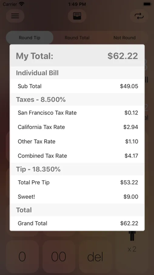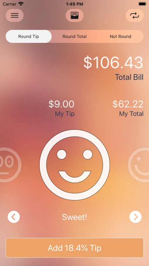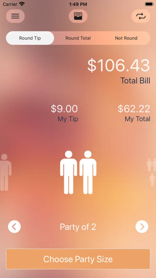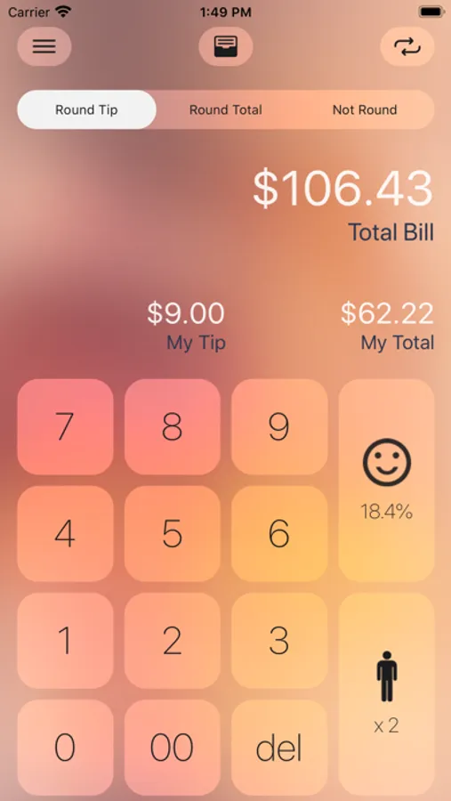 When you fire up the app, type in your total bill. Then tap the face and person icons to swipe your way to the appropriate tip and the number of diners. It's that easy! And for all you people who like things even more nice and neat, Ez Bill can split your bill with a rounded tip amount or rounded total.