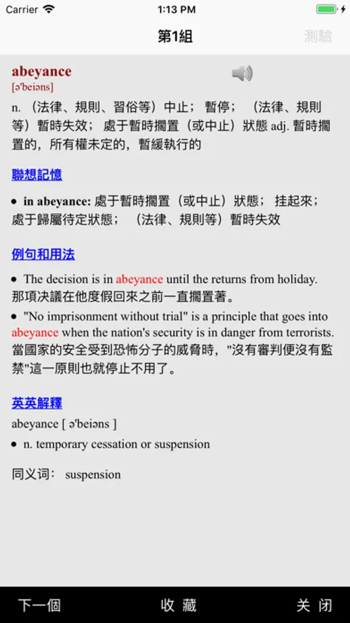 全文有声词典支持: 每个单词都提供详尽的中文解释、音标、发音、例句用法、联想记忆、词语辨析、英英解释等,帮助你快速记忆学习英文单词。 提供单词收藏以及测试错题库等功能, 简便易用实用!