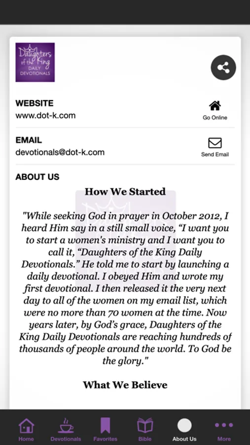 Daughters of the King Daily Devotionals is designed to inspire women around the world, to pray for revival among us, and to encourage unity. Through our daily devotionals, we reach hundreds of thousands of readers throughout the world every day and have received countless testimonies of spiritual growth and transformation in the lives of many.