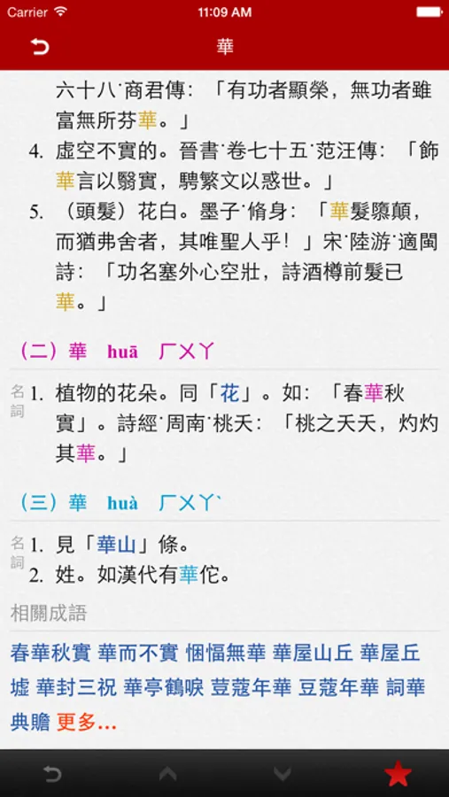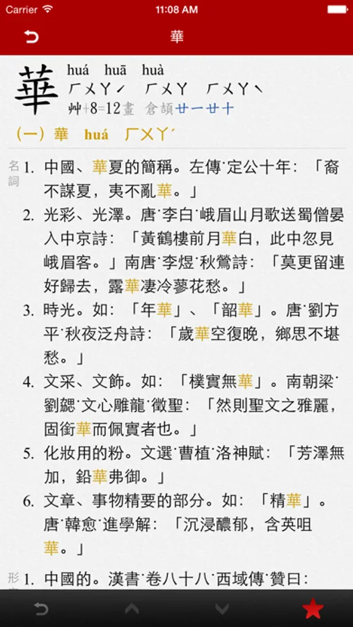 + 按照漢字的讀音(語音)、詞性分級列出釋義,層次分明,方便查閱。