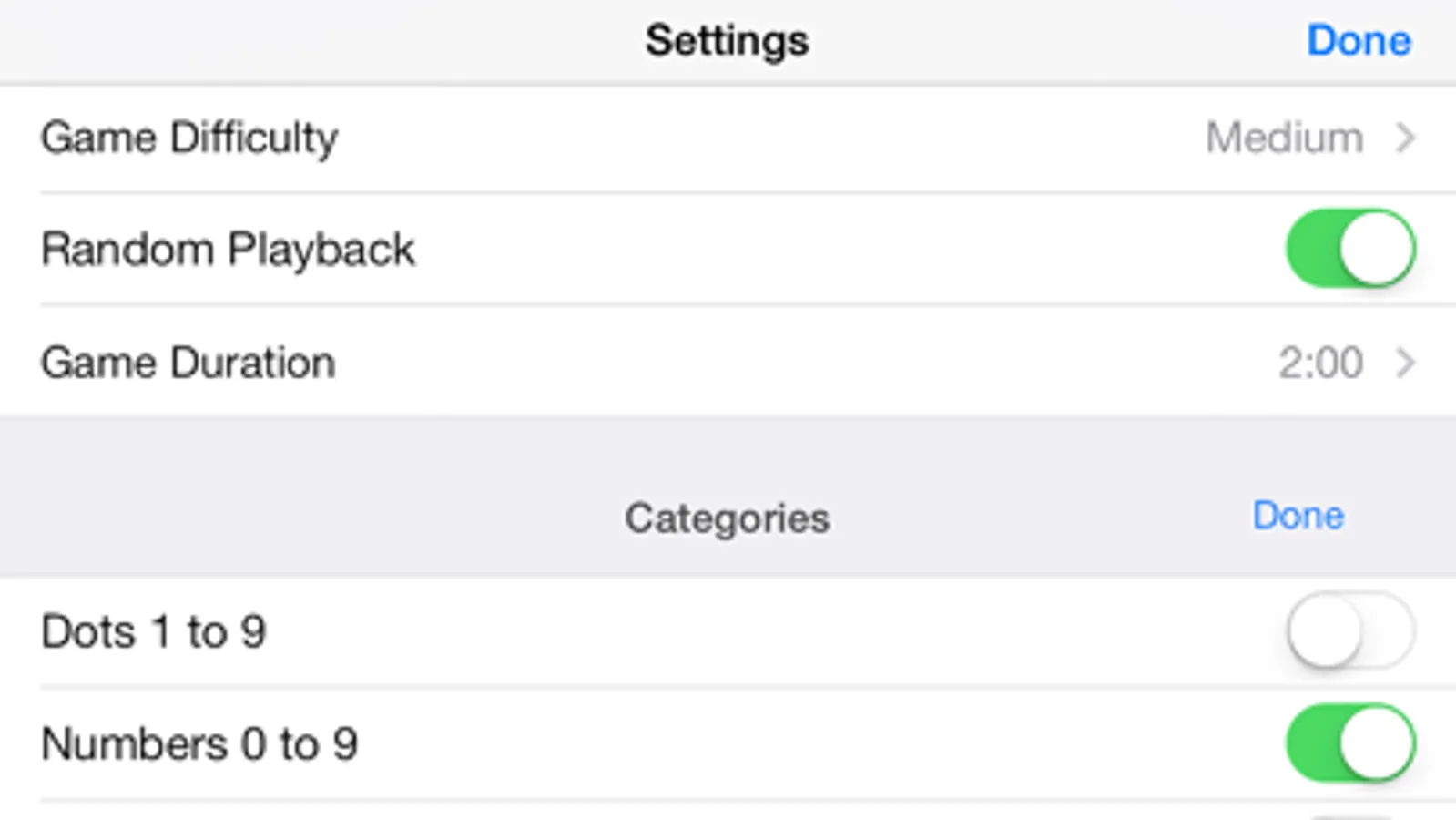 • Want to work on just a few numbers? No problem… head to the settings page to turn entire categories or individual numbers on and off