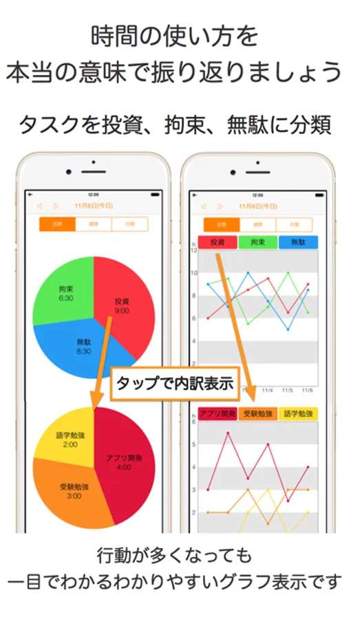 記録をグラフで振り返る際、まず「投資」「無駄」「拘束」に分けられ、「投資」「無駄」「拘束」をタップするとそれぞれの内訳が表示されるようになっています。