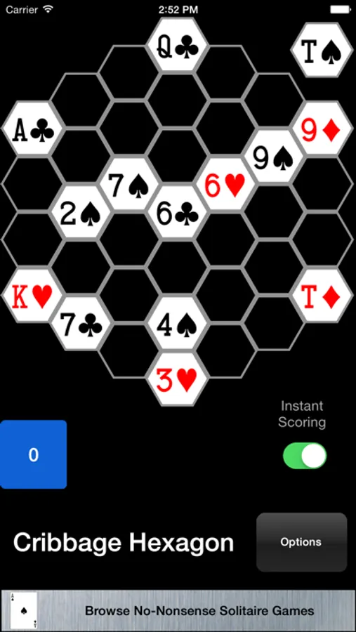 CRIBBAGE HEXAGON: Place cards in a hexagonal grid trying to make the best hands on the verticals and the diagonals.