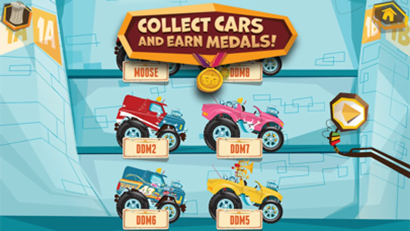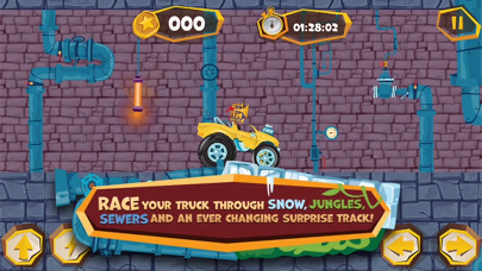 - RACE: Race your truck through snow, jungles, sewers and an ever changing surprise track for unlimited play