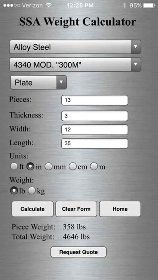 A metal weight calculator for the following materials - Stainless Steel, Alloy Steel, Maraging Steel, Titanium, Nickel Base Alloy, INVAR, and Armor Plate.