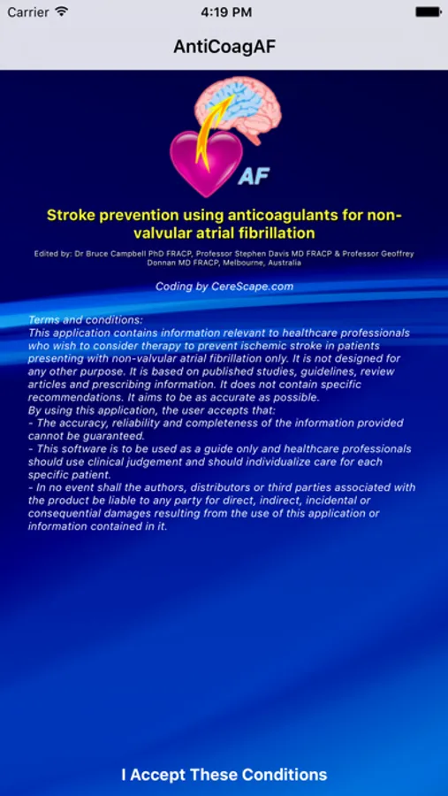 Information contained within the application was edited by Dr Bruce Campbell. Coding was by CereScape (www.cerescape.com). It is our aim to keep this information current, and we welcome constructive comments and evidenced updated information. Any profit generated by this application will be used to fund stroke research.