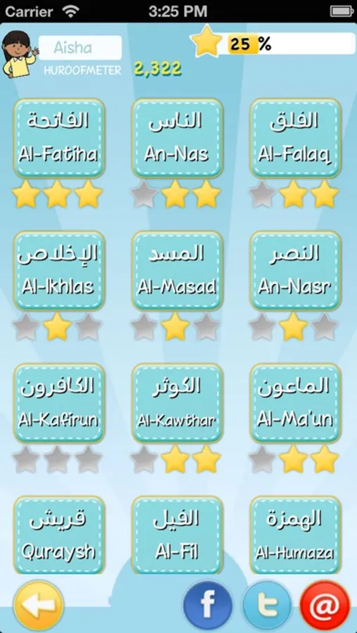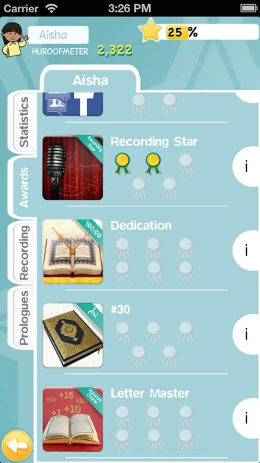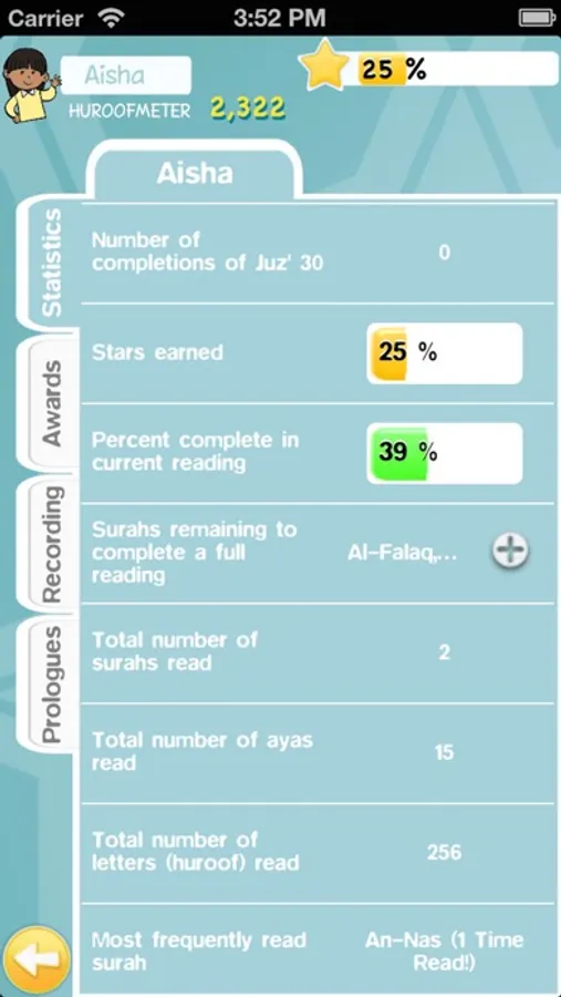Earn 3 gold stars on every surah as you read, learn & memorize the final Juz' (section) of the Quran. Customize multiple user profiles, track your statistics and unlock in-app awards. Be proud of your accomplishments, share status updates on social media, challenge your friends to read and memorize the Quran along with you! Quran Star also has a recording feature built into the app that allows a user to test their memorization of each surah and send recordings to friends and family. Finally, our unique HuroofMeter counts the number of letters you read through each ayah. Can you read one million letters and earn one of Quran Stars toughest awards?