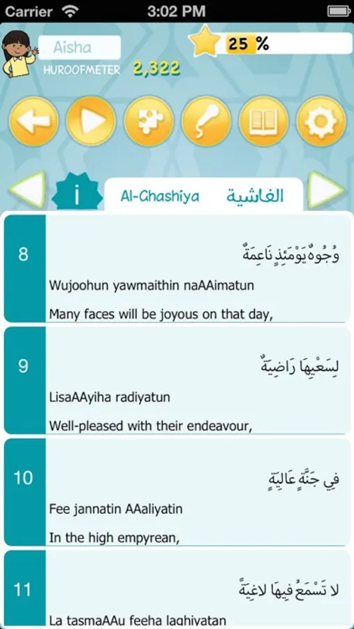 -‘Huroofmeter’ tracks total no. of letters read (can be enabled/disabled)