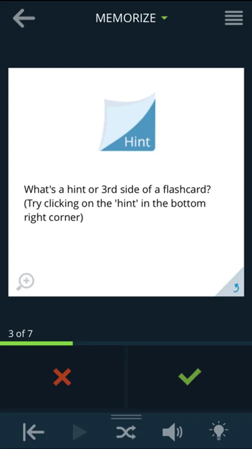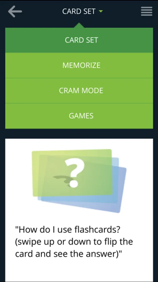 Card mode allows you to quickly view an entire set of flashcards and repeat them as often as you like. Memorize mode automatically hides flashcards you know so you can concentrate on the ones you still need to learn. You can even enable the cram option to supercharge your studying with spaced repetition similar to the Leitner system!