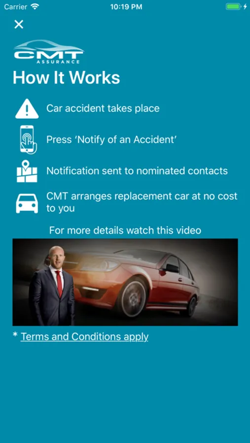 CMT Car allows you to quickly notify a contact of your choice in the unfortunate event of a car accident. CMT is notified at the same time, so we can instantly begin arranging a Luxury Replacement Vehicle for you to drive while your car is off the road.