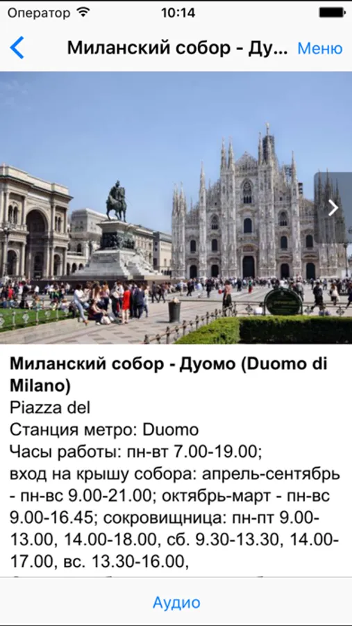 ● АУДИОГИД ПО МИЛАНУ. Рассказы аудиогида озвучены профессиональным диктором на студии звукозаписи. Слушайте рассказы, не отвлекаясь от осмотра достопримечательностей и не теряя время. Не стоит лишний раз портить зрение, читая на ходу текст на небольшом экране.