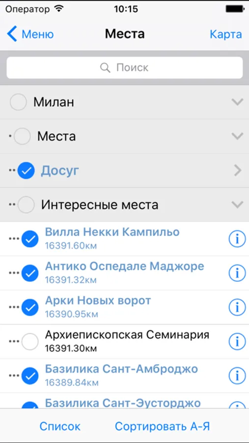 ● ПРОГУЛКИ ПО МИЛАНУ. Не все интересные места, которые стоит посетить в Милане, можно включить в экскурсионные маршруты. Составьте свой собственный план прогулки по городу, просто выбрав в каталоге нужные места, и они сразу будут отображены на карте. При этом остальные объекты вы можете временно убрать с карты.