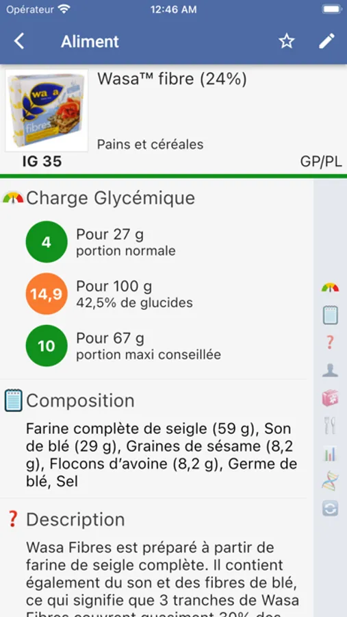 • la charge glycémique (pour 100 g, pour une portion, et la portion maxi conseillée)