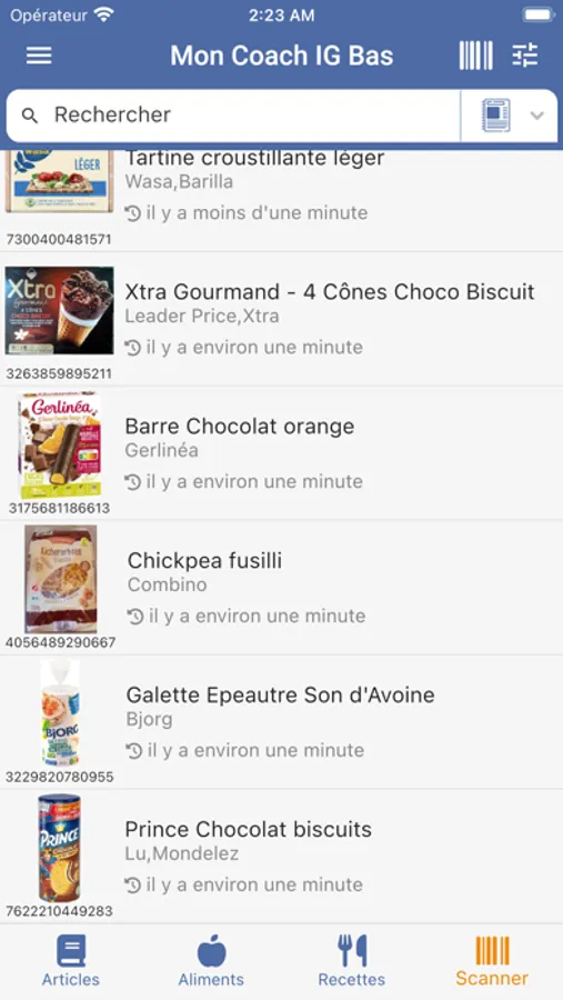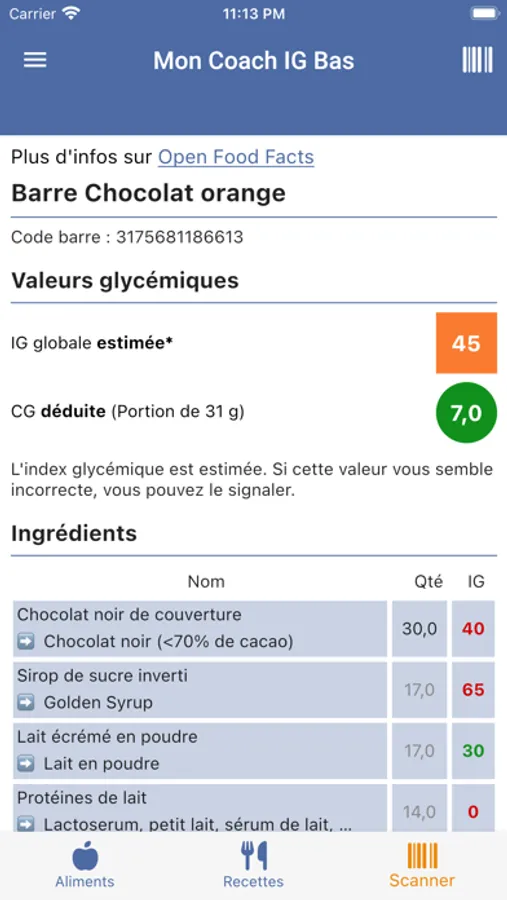 Scannez le code-barres se trouvant sur l'emballage de l'aliment pour découvrir ce qu’il contient. Si le produit est référencé sur Open Food Facts, la liste des ingrédients sera récupérée et l’index glycémique s’affichera en face de chaque ingrédient, rendant plus facile la détection d’aliments néfastes comme le E190d (caramel), la maltodextrine ou encore le sirop de glucose-fructose… Le scanner tente d'estimer l'index glycémique ainsi que la charge glycémique de l'aliment scanné !