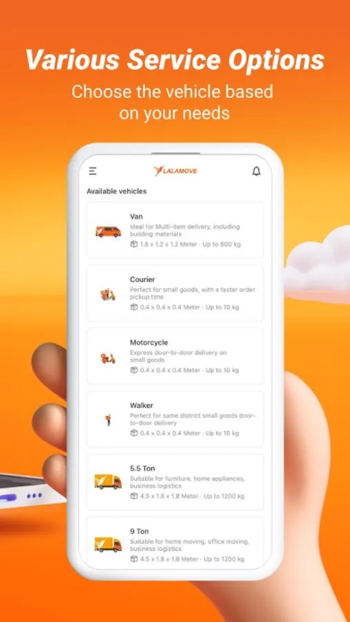 You can choose from a range of vehicles, including motorcycles, vans and trucks, depending on the size of your shipment. Whether you're delivering a single document or an entire truckload of goods, Lalamove has the right vehicle for the job.