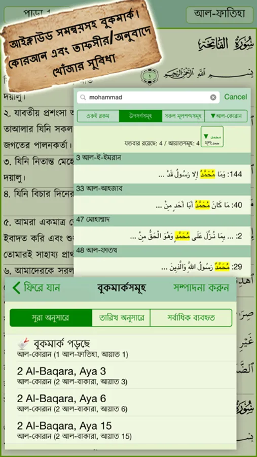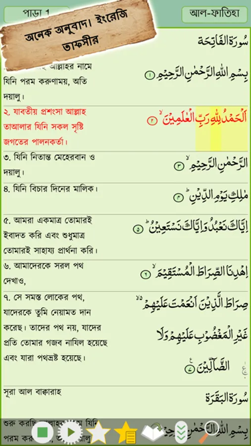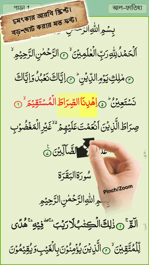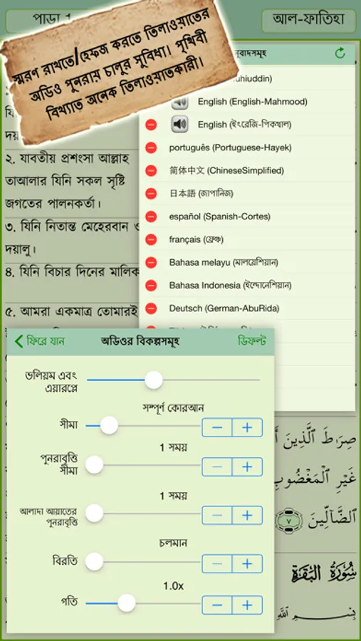 ● Option to display any translation and Tafsir along with full Arabic text in hi-resolution, retina graphics in both portrait and landscape viewing. Option to display side by side Bangla translation (juz 1 only for free version). Supports pinch/zoom feature for changing font size.