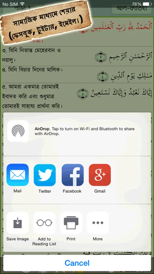 ● Social media sharing. Ability to share selected aya via email, twitter & Facebook.