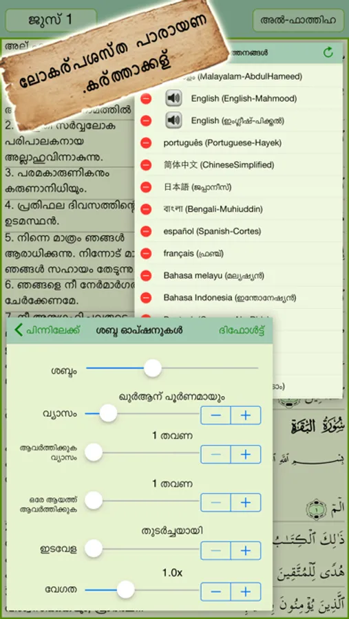 ● Malayalam translation (For 1st Juz/para only in free version). Full version has four English translations (Pickthal, Dr. Mohsin, Mahmood & Yusuf Ali) and forty-five language translations (AlBanian, Amazigh, Amharic, Azerbaijani, Bengali, Bosnian, Bulgarian, Chinese, Divehi, Dutch, French, German, Hausa, Hindi, Indonesian, Italian, Japanese, Korean, Malayalam, Malaysian, Norwegian, Persian, Polish, Portuguese, Romanian, Russian, Sindhi, Somali, Spanish, Swahili, Swedish, Tajik, Tamil, Tartar, Turkish, Urdu, Uyghur, Uzbek).