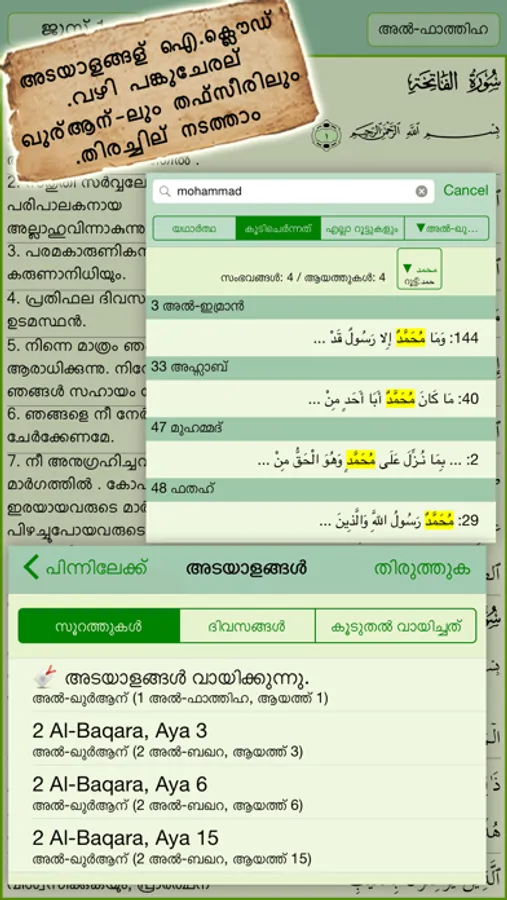 Malayalam Quran Majeed is the only app that offers the most beautiful Arabic Quran text (proofread by a Muslim scholar 'alim), in the elegant font used in India, Pakistan and Bangladesh region that you will find on a mobile device. The latest version of the authentic Quran Majeed app for iPhone and iPad offers complete Arabic Quran, audio recitation and translations, along with the latest new feature of Malayalam translation and English Tafsir/commentary.