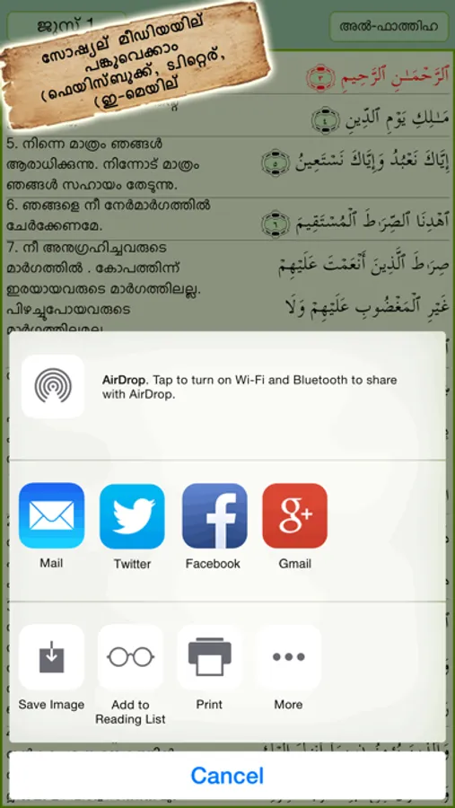 ● Social media sharing. Ability to share selected aya via email, twitter & Facebook.