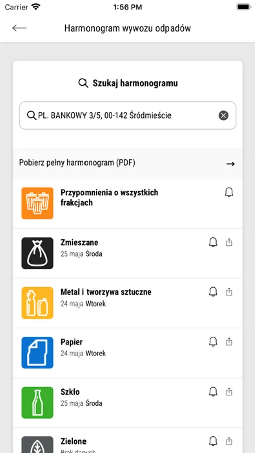 W zakładce harmonogram wywozu odpadów sprawdzisz terminy odbioru śmieci pod interesującym Cię adresem lub adresami, oraz ustawisz powiadomienia przypominające o ich terminach . Poznasz zasady prawidłowej segregacji śmieci, a jeśli masz wątpliwości wyszukiwarka podpowie gdzie co wyrzucać.