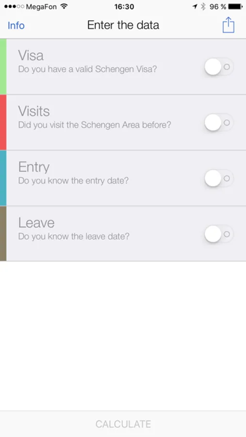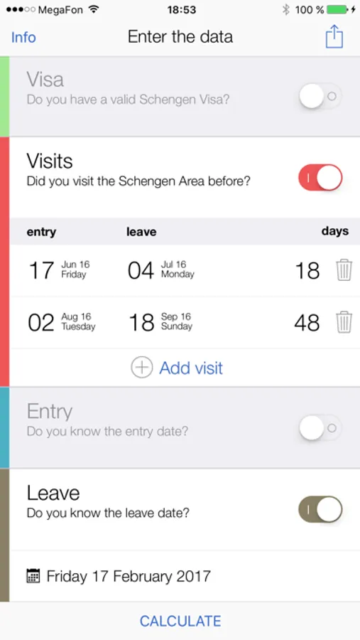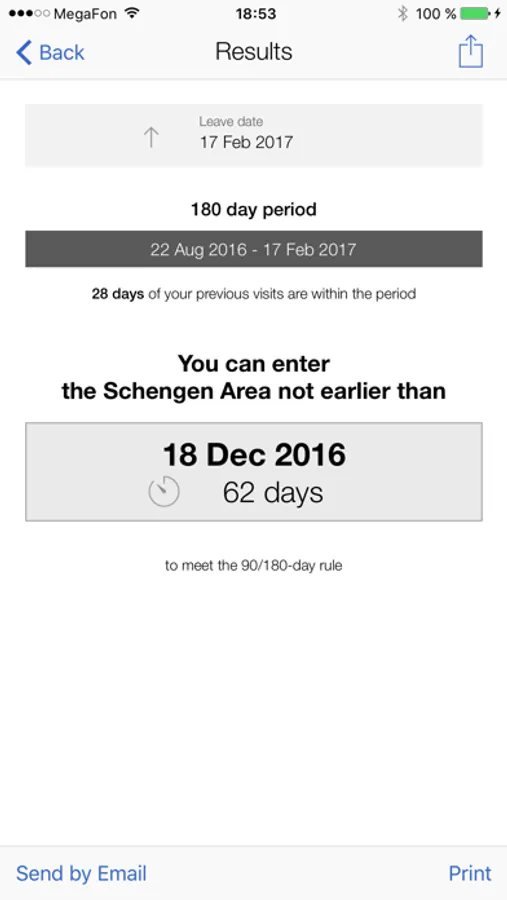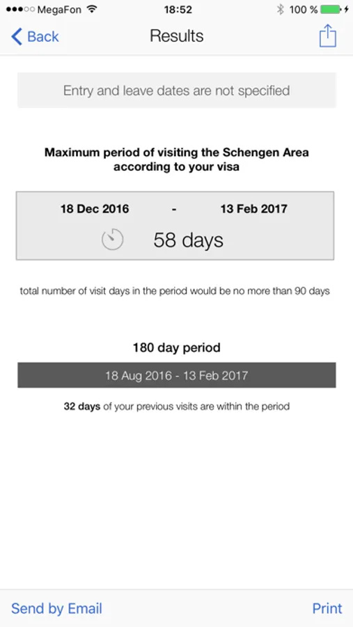 The app will save the history of your visits locally on your iPhone, iPod or iPad. It will count the days you already used and will suggest duration for your next trip.