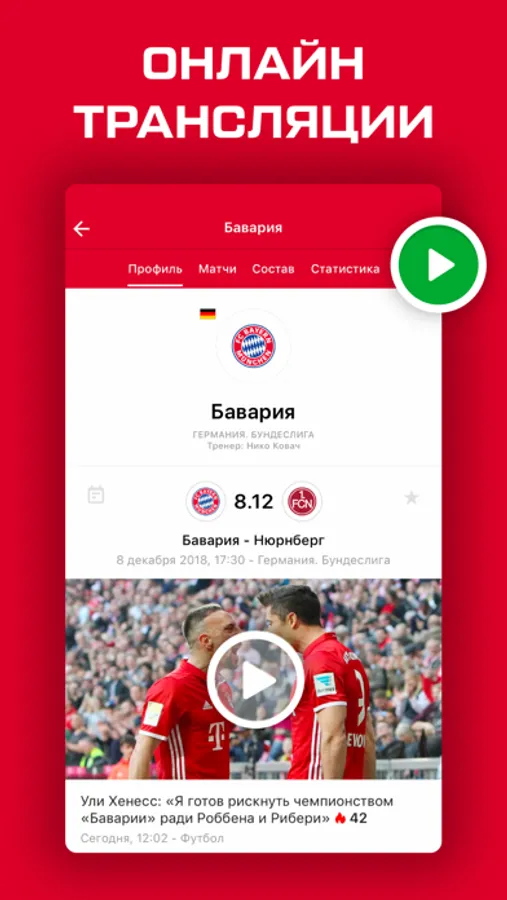 • Онлайн трансляции матчей и состав команды;