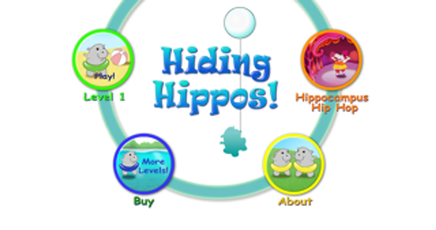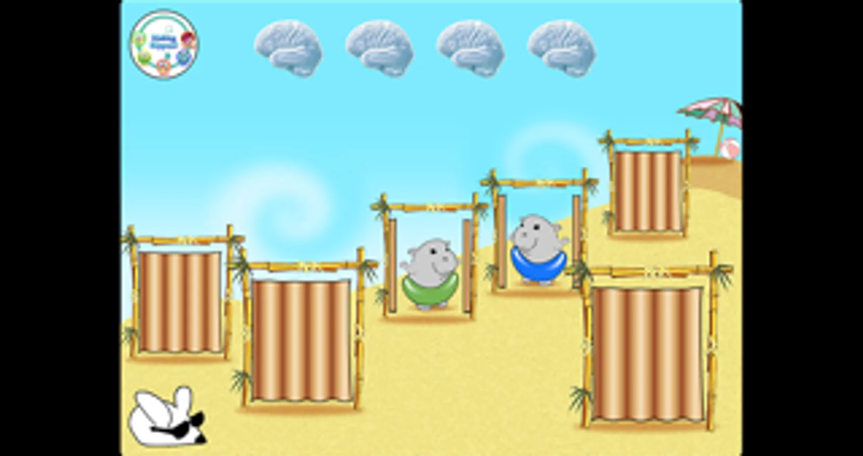 In the first (free) level, hippos wearing various colorful swim tubes run in and out of beach cabanas, laughing as they go. Two of the hippos hide behind cabanas and the player is asked to find different color hippos. After finding all the hiding hippos, a segment of the Hippocampus Hip Hop song plays with nuggets of knowledge about memory and the hippocampus.