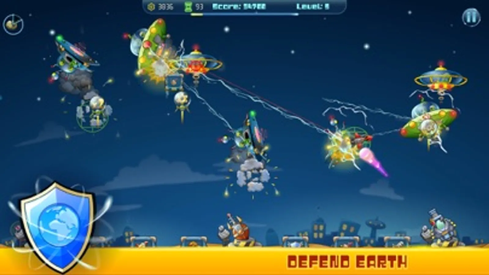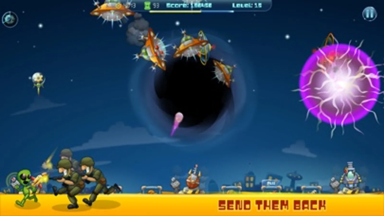 Rush in defence action and clash with the alien invaders using strategic weapons like classic Missile, Laser, Plasma Missile, Black Hole, Nuclear Missile (Armageddon) and Heat-Seeking Missile!